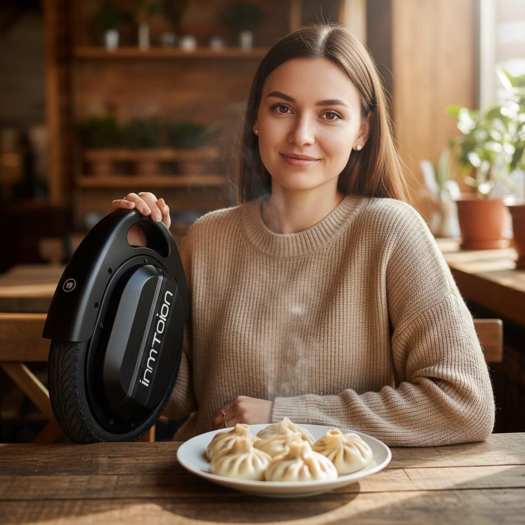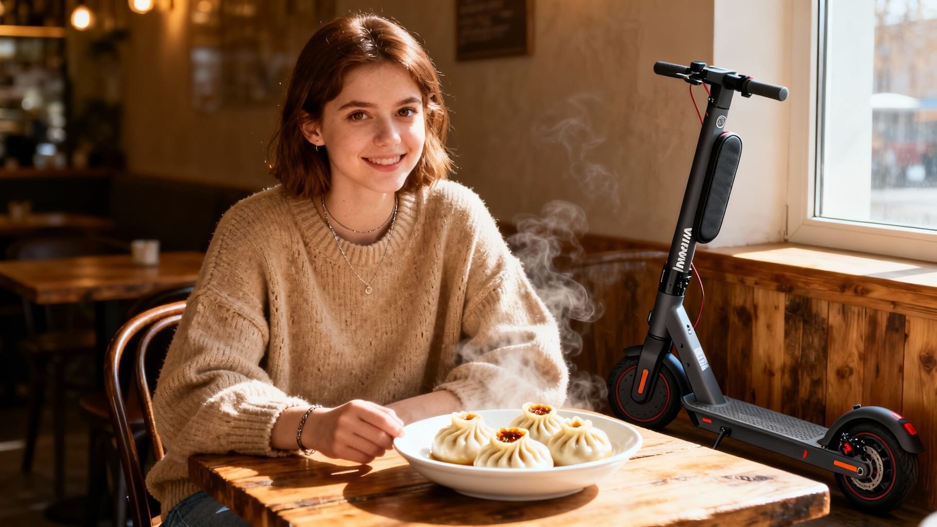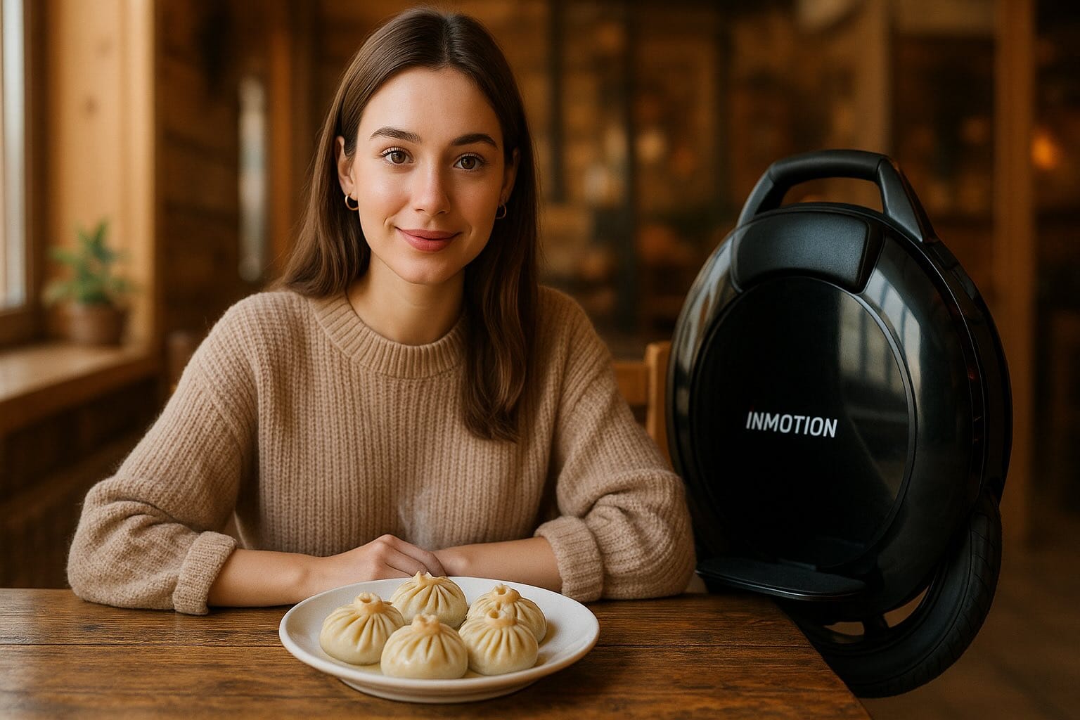 A beautiful 20-year-old girl with brown eyes and a friendly expression sits at a rustic wooden table inside an authentic, sunlit Siberian cafe. She is wearing a trendy urban casual outfit consisting of a high-quality beige oversized knit sweater and minimalist jewelry. In front of her sits a steaming, white ceramic plate holding several authentic Buryat buuz, meticulously rendered with the traditional circular shape, visible dough pleats, and the characteristic small opening at the top revealing savory juices inside. Beside the plate is a modern Inmotion V8 electric unicycle leaning against her chair, showing its distinct slim profile, side padding, and integrated handle. The background is softly blurred, showing the cozy interior of the cafe with wooden textures and warm ambient lighting. The overall image has a clean, professional photographic quality with natural daylight streaming through a nearby window, emphasizing the realistic textures of the food, the fabric of her sweater, and the sleek finish of the unicycle.